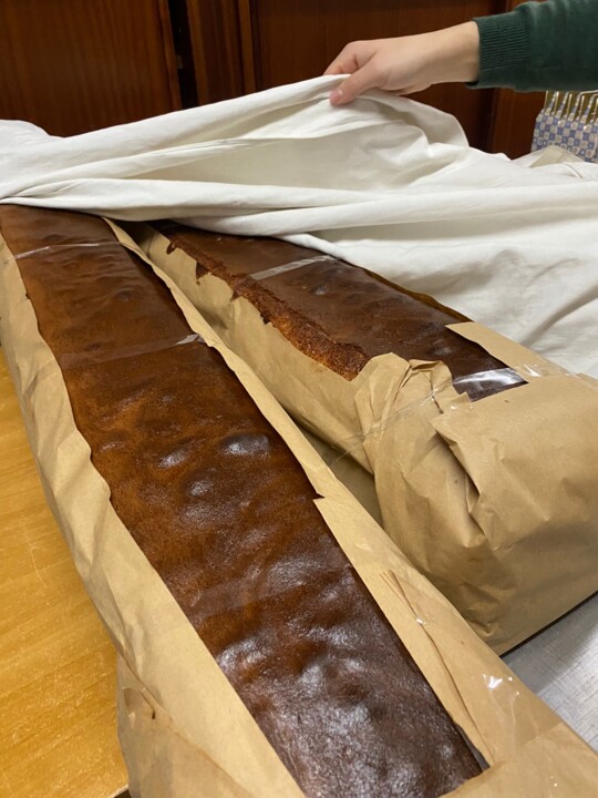 Ficamos espantados, com o tamanho das formas, onde fazem as fatias do pão de ló, dá para 39 fatias cada uma. Depois de feito o bolo vai arrefecer, para ser cortado às fatias no dia a seguir, agora com um molde, (antes eram medidas com um compasso), para depois levarem o banho de açucar, e por fim ser feito o seu embalamento.