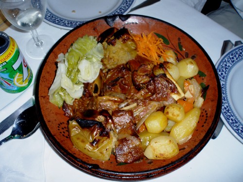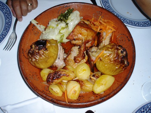 Para começar as entradas estavam uma delícia, e o cabrito e vitela assada também estavam muito bem preparados, acompanhados com verdura, arroz, batata e maça assada.